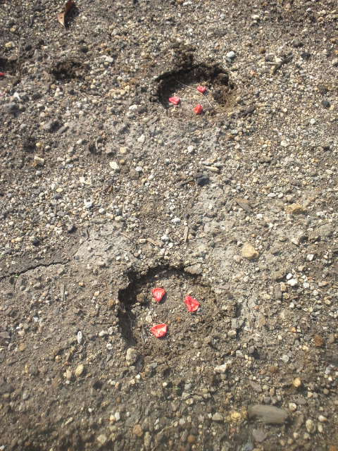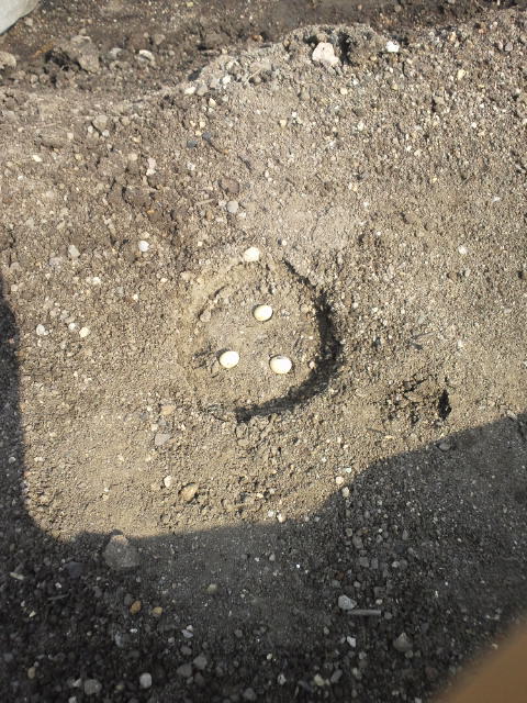 どちらも、畝に缶などを使って押さえて穴を開け3粒づつ蒔いていきます。
