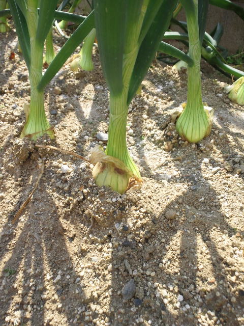 草刈りに畑に行ってみると、玉ねぎがかなり肥大していました。