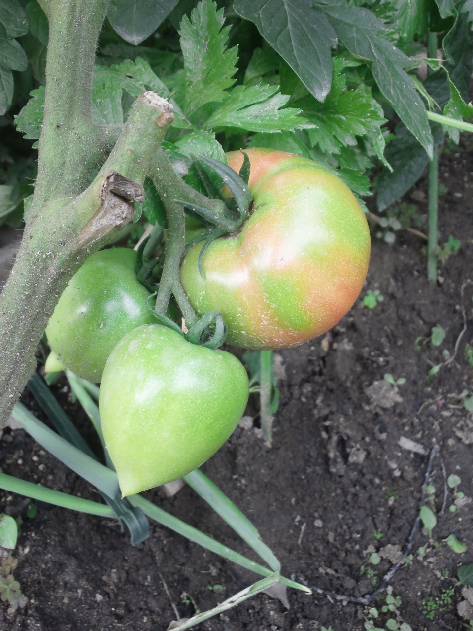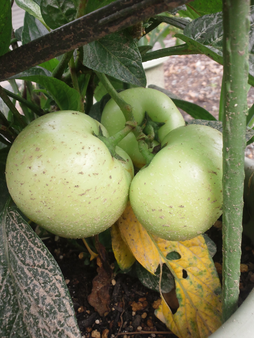 台風被害を受けた大玉トマトは、まだまだ緑が多いものの、ほんのり赤くなってます。