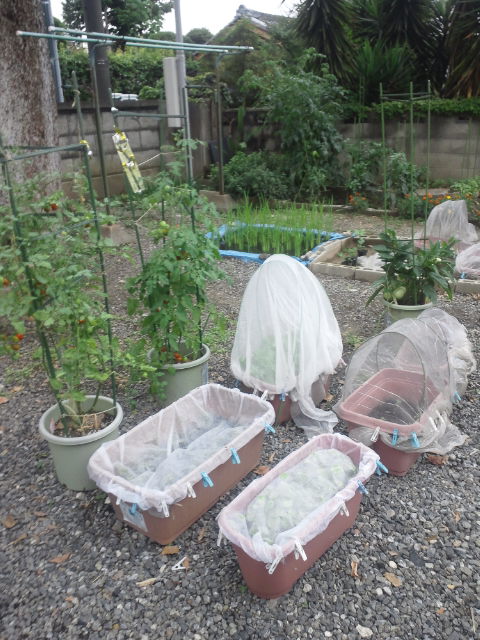 害虫被害に会いやすい葉ものは、プランターでネットをかけて栽培中。