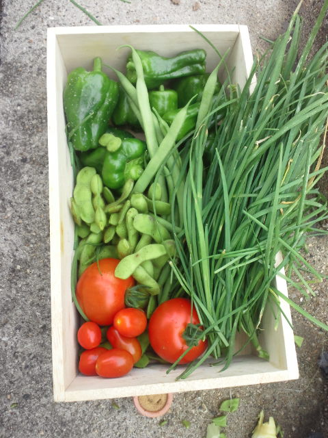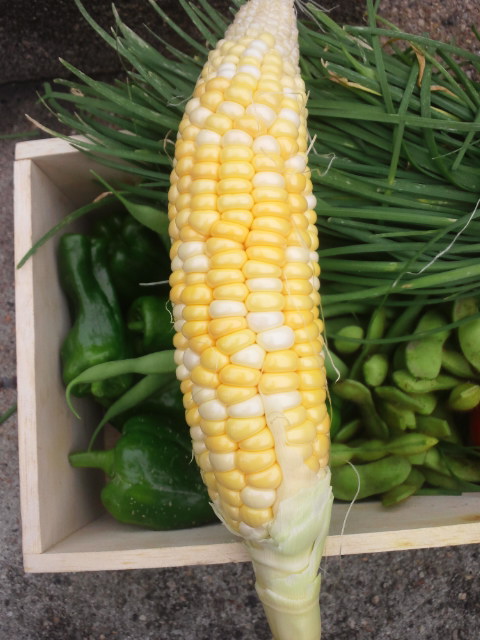 今日の収穫は、トウモロコシの他に、トマト、ピーマン、インゲン、枝豆、ニラです。