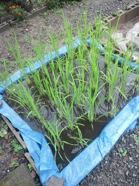 ブルーシート水田の稲も水を得て生き生きしてます。