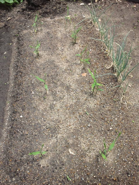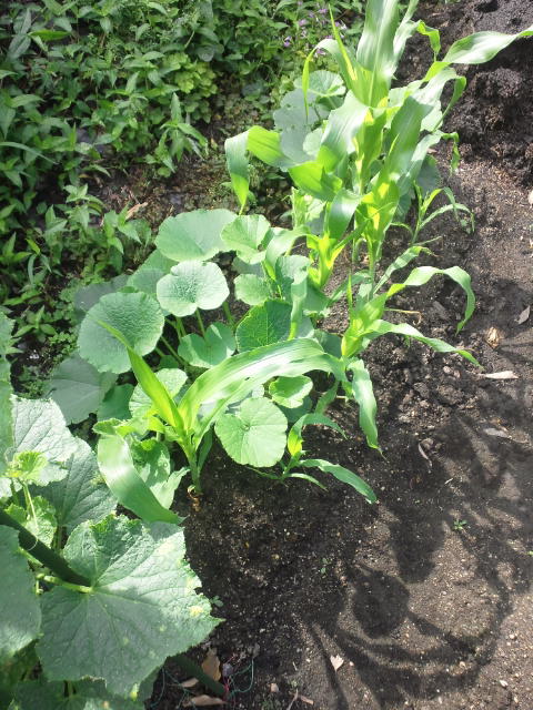 カボチャの脇に刺した間引きトウモロコシは、シッカリ根づいたようす。