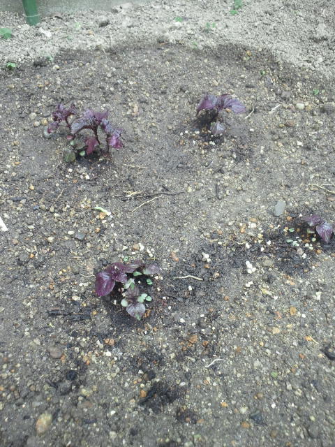 シソの苗は、まだまだ小さいですが、しっかり紫の葉が出ています。